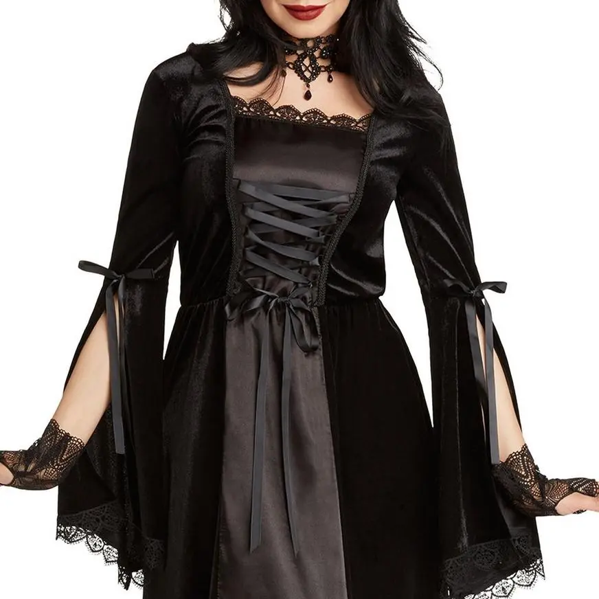 Whether you’re a fair maiden or a wicked witch, show up to the Renaissance faire with the most elegant look in a black dress for adults! The crushed velvet dress features sleeves slit at the elbows, lacing on the bodice, and a satiny center panel. Complete your medieval look with this elegant gown!