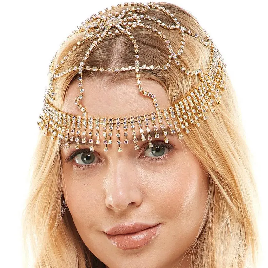 Dazzle the room in your flapper costume with this rhinestone head cap. This 1920s-inspired headpiece features white rhinestones set in gold-colored metal.