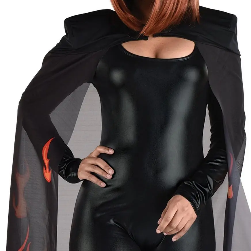 Top your Halloween costume with a bit of spice. This sheer black cape features padded shoulders and a flame print that begins at the bottom and creeps its way up.