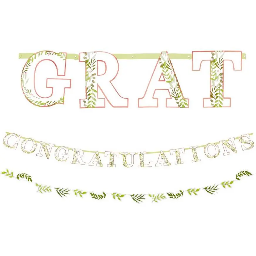 Wow bridal shower brunch guests when you welcome them using a Floral Greenery Jumbo Letter Banner with Mini Banner! The floral banner has jumbo cardstock cutouts of individual white letters covered in mini flowers and greenery which spell out “Congratulations.” The mini banner features cardboard cutouts of small green branches and leaves that are strung along a white ribbon. Host a special event for the bride and groom using these wedding decorations.