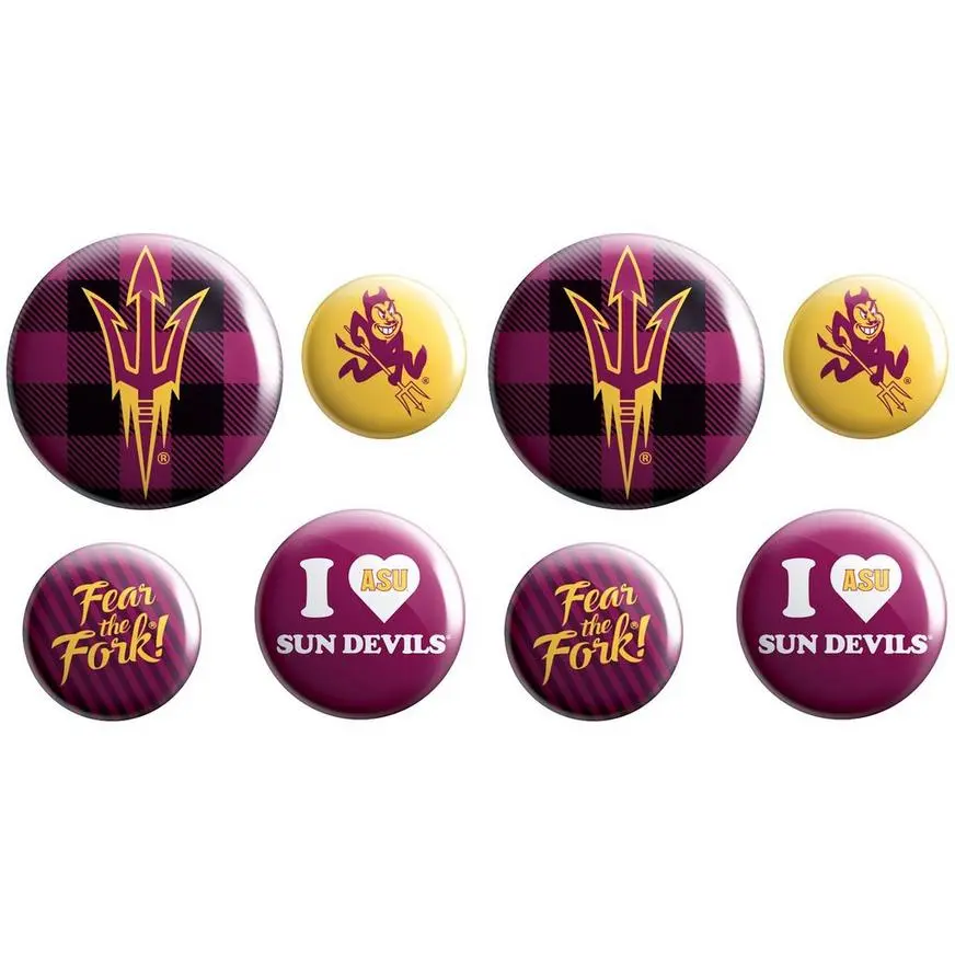 Wear your team pride everywhere you go! These Arizona State Sun Devils Buttons come in eight different designs featuring the team’s logo and colors. Pin them to your gym bag, T-shirt, backpack, and more, or share them with fellow fans at your next tailgate party. Arizona State Sun Devils Buttons have a safety pin closure.