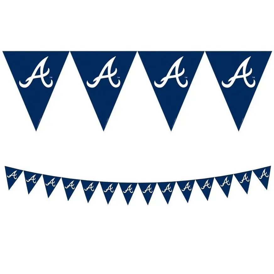 Decorate for the big game with an Atlanta Braves Pennant Banner, featuring the official team logo on pennants strung together with thread. This lightweight decoration can be hung from the ceiling or attached to a window or wall with tape or Sticky Tack (sold separately).
