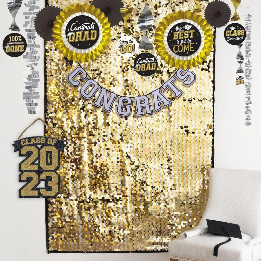 | 1 | Metallic Gold & Silver Congrats Graduation Sequin Foil & Cardstock Backdrop Kit, 4ft x 6ft, (SKU 935515) |