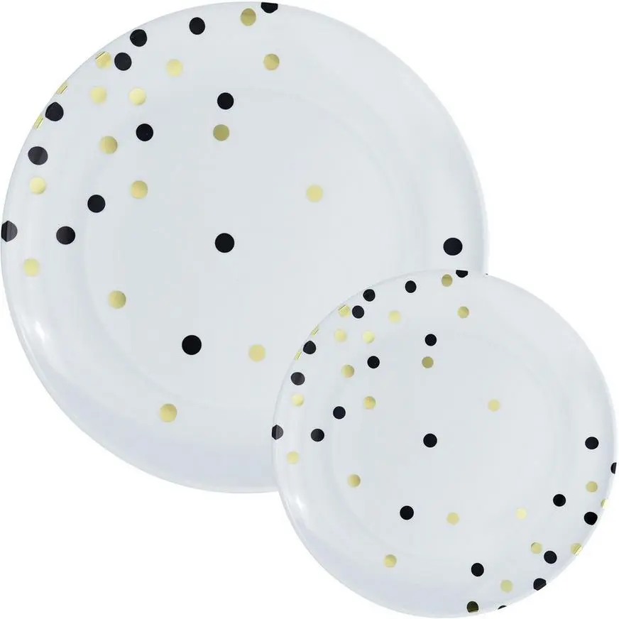 Set a fun and festive table for your guests with Confetti Plates! This set includes two sizes of premium plastic plates that feature black and gold metallic confetti dots on a white base and a raised raised inner lip. Create lively table settings for holidays and special occasions with these whimsical plates.