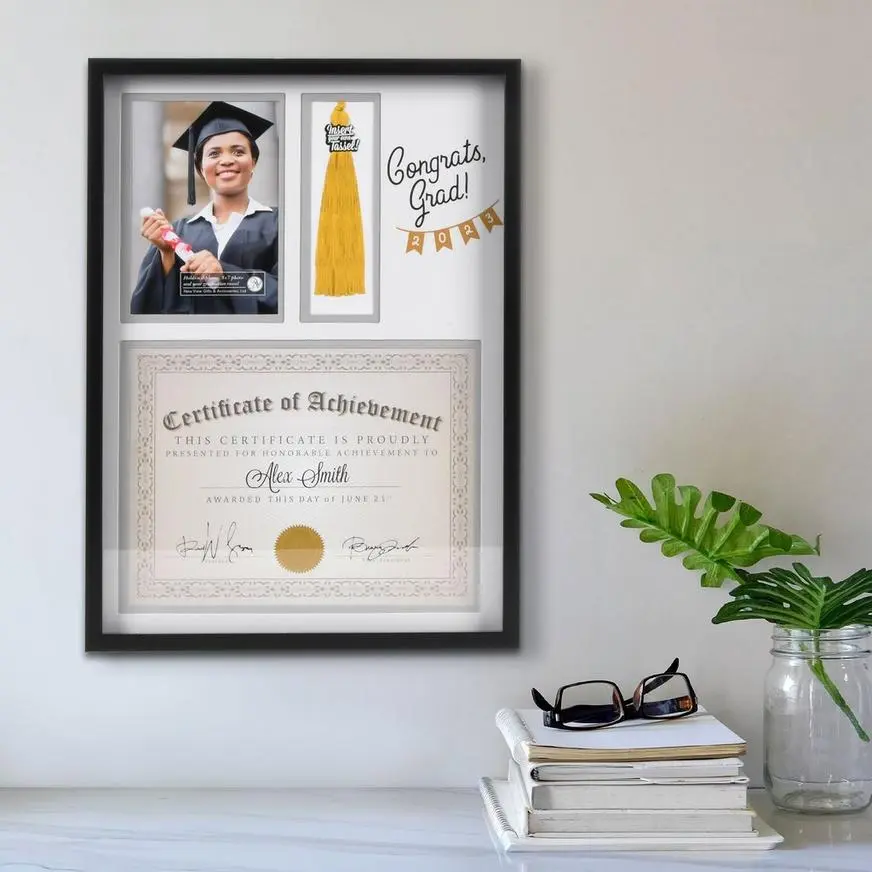 Preserve the symbols of their big achievement all in one place. This plastic frame features a printed “Congrats Grad 2022” headline along with spots for a photo, a diploma, and a mortarboard tassel.