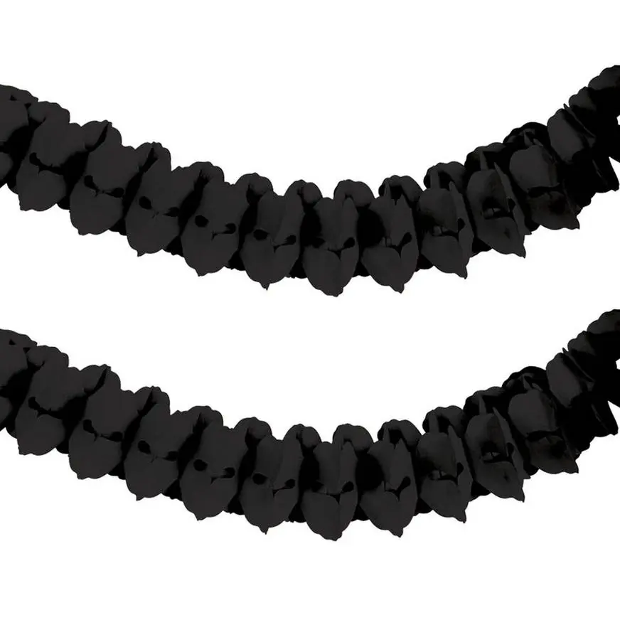Add dramatic impact with this Black Paper Garland. It dresses up the party room for nearly any occasion; just drape it along banisters, tables, or the ceiling, or hang it vertically from ceiling to floor.