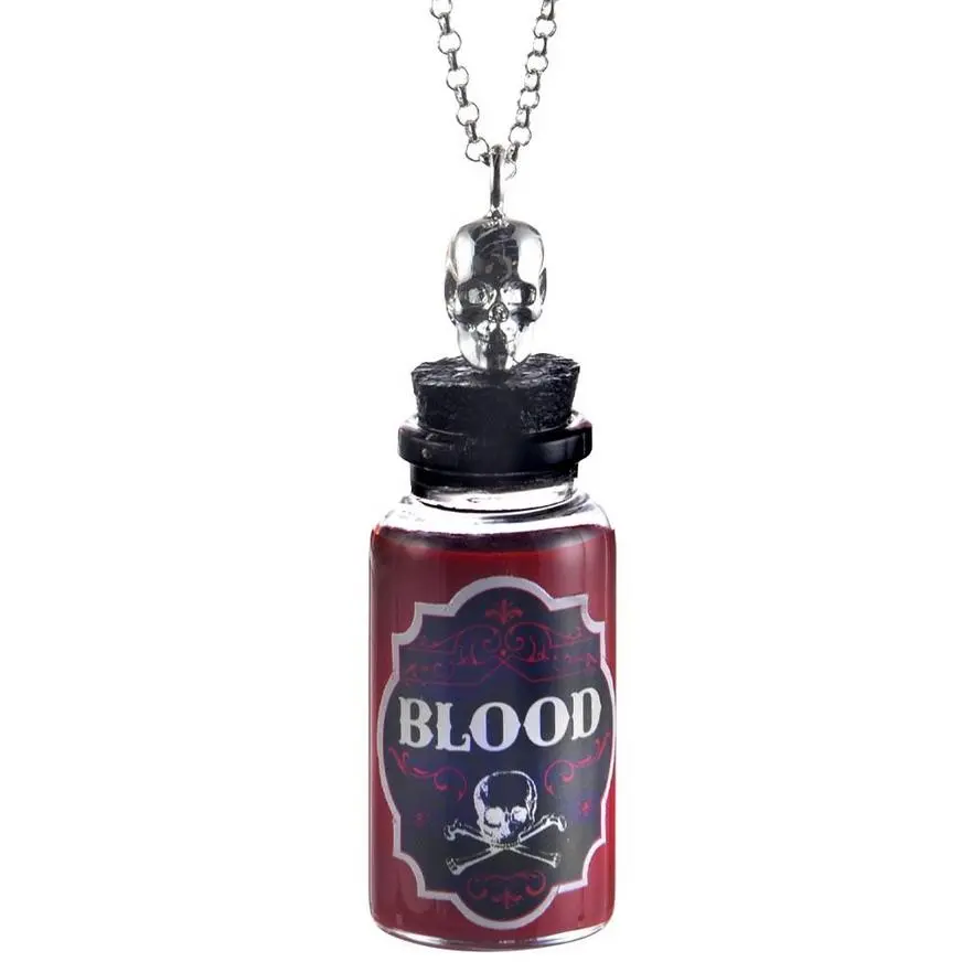 Unleash your dark side this Halloween with the Blood Bottle Necklace. Fit for a vampire, this necklace features an adjustable silver metal chain and a glass blood bottle pendant with a printed label, black cork, and silver metal skull fob.