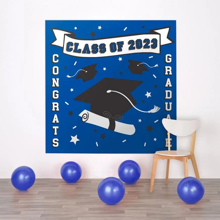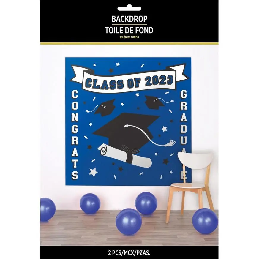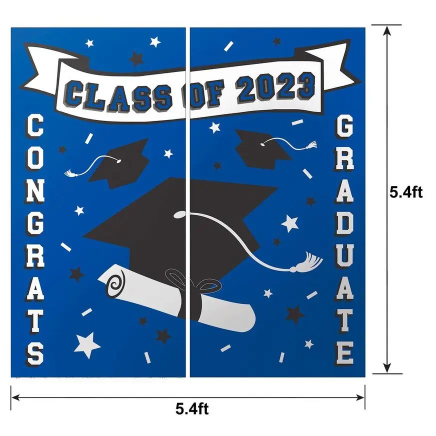 Made of thin plastic sheets, this poster set comes together to create a seamless design that features graduation caps, diplomas, stars, and confetti. “Class of 2023” is printed in large collegiate letters across the top and the phrase “Congrats Graduate” is split between the two sides. Choose their school color or even their favorite color for the perfect photo booth backdrop.