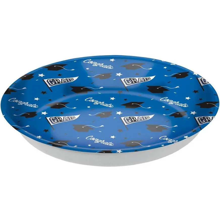 Serve up chips, salads, and other tasty treats in this bowl! The reusable plastic dish is blue to match their school colors, with “Congrats” and “Grad!” messages, black mortarboards, and white stars.