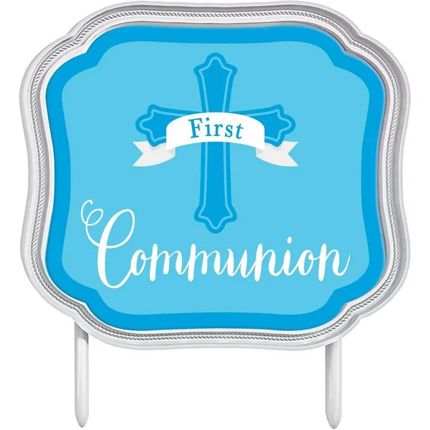 Dress up your dessert with this Blue First Communion Cake Topper. This cake topper features a “First Communion” headline over a blue cross print inside an elegant silver border. Two sturdy prongs keep it in place. Put the finishing touch on your First Communion dessert with this lovely cake decoration.