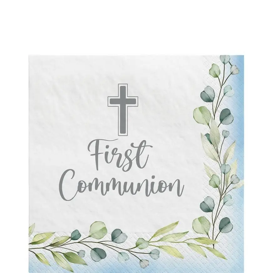 Set a buffet to celebrate their blessed day with Blue My First Communion Lunch Napkins. These paper napkins feature a silver cross above the matching headline “First Communion.” A leafy garland and light blue border beautifully complete the design.