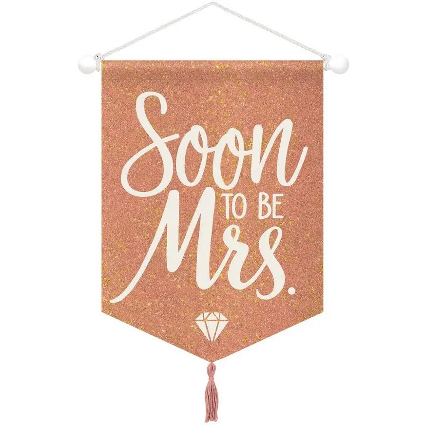 Your bridal shower decor will sparkle and shine with the Blush & Rose Gold Soon To Be Mrs. Sign Canvas Sign! This pink canvas sign features a white “Soon To Be Mrs.” headline with a diamond icon at the bottom center of the sign. Hang this birdal shower decoration on a door or wall in your event space.