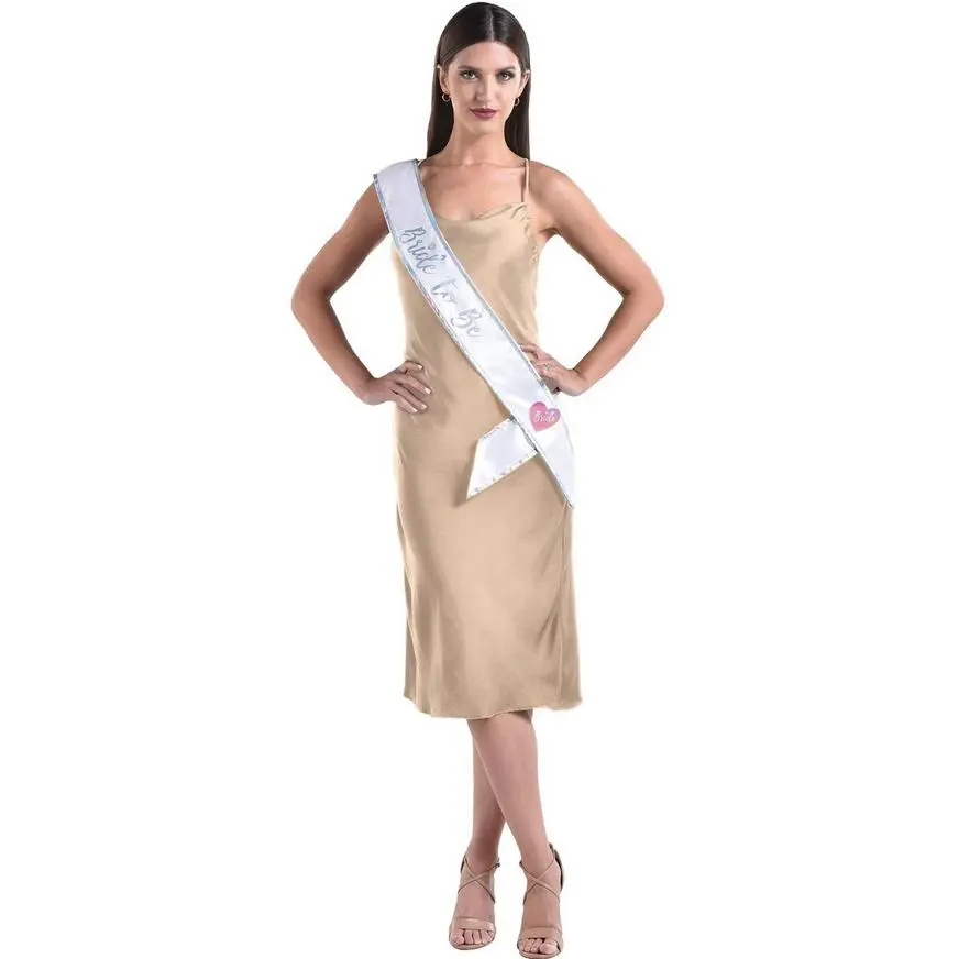 Here comes the bride! This white faux-satin sash features the phrase “Bride to Be” in silver writing and a silver ribbon border. Hold the sash in place with a pink heart-shaped metal pin with the word Bride and butterfly backing to secure. The perfect accessory for the bride at her bachelorette party or bridal shower.