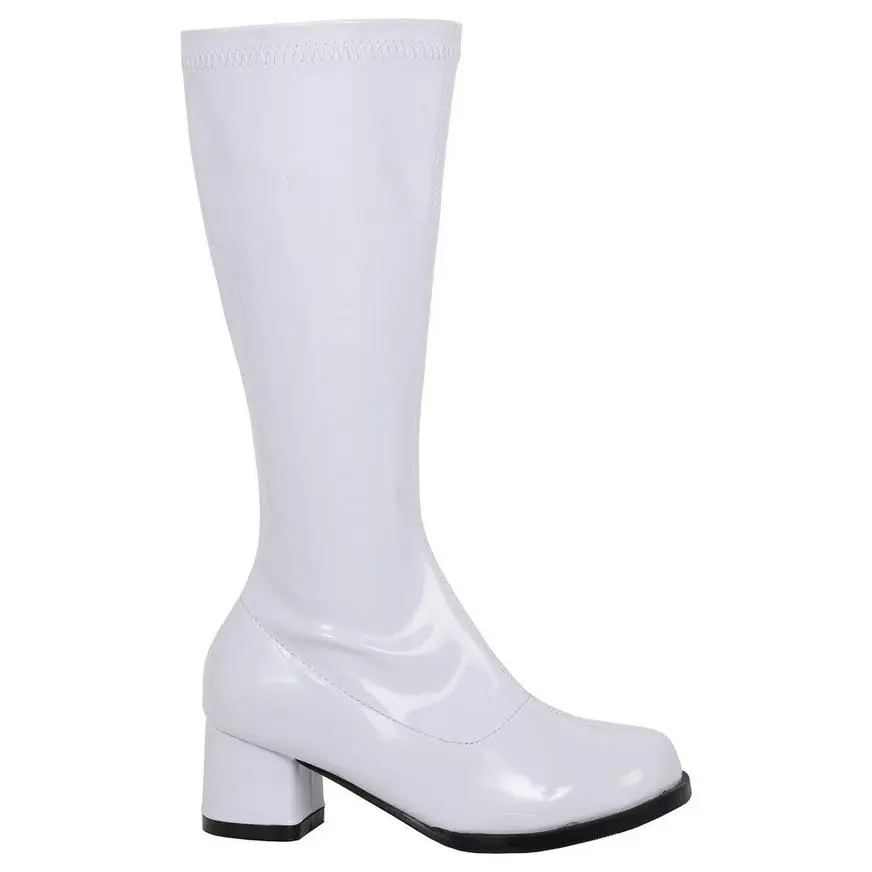She is the dancing queen in White Dora Go-Go Boots. These groovy white go-go boots feature a glossy finish with a thick block heel for extra comfort. The side zipper makes it easy to slip these disco costume boots on and off. Pull her go-go dancer costume together with these white disco boots.