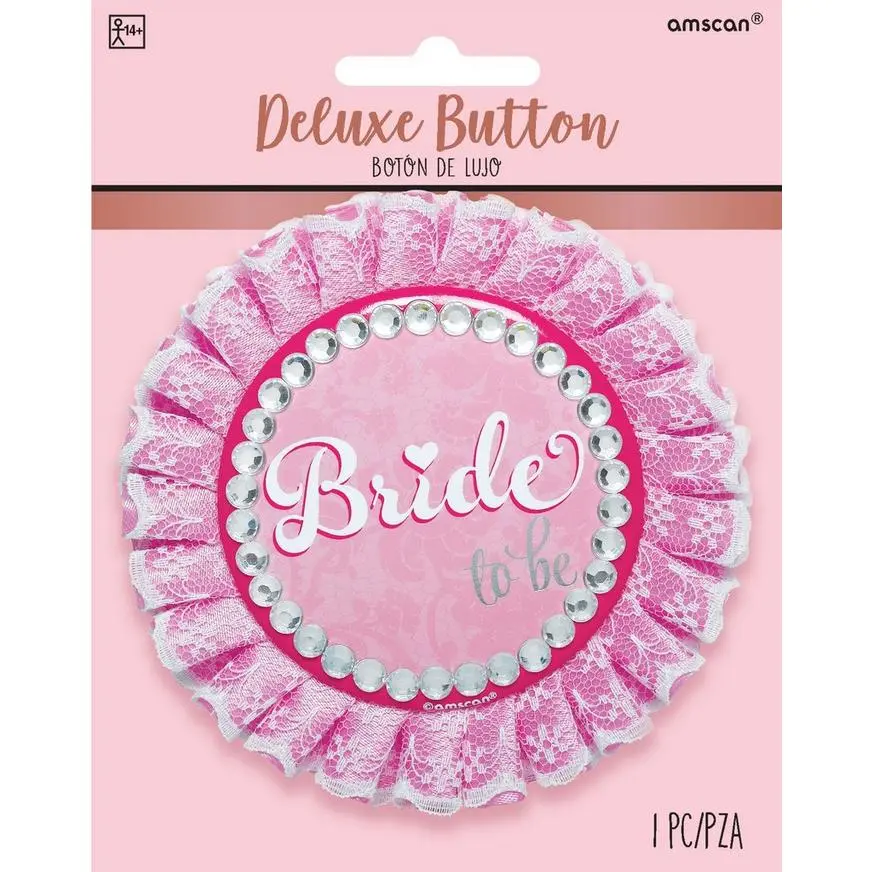 Does the bride-to-be prefer subtle accessories? Pin a Deluxe Classy Bride Button onto her outfit at her bachelorette party! This large pin-on value features a “Bride to be” headline and is trimmed with clear rhinestones and white lace.