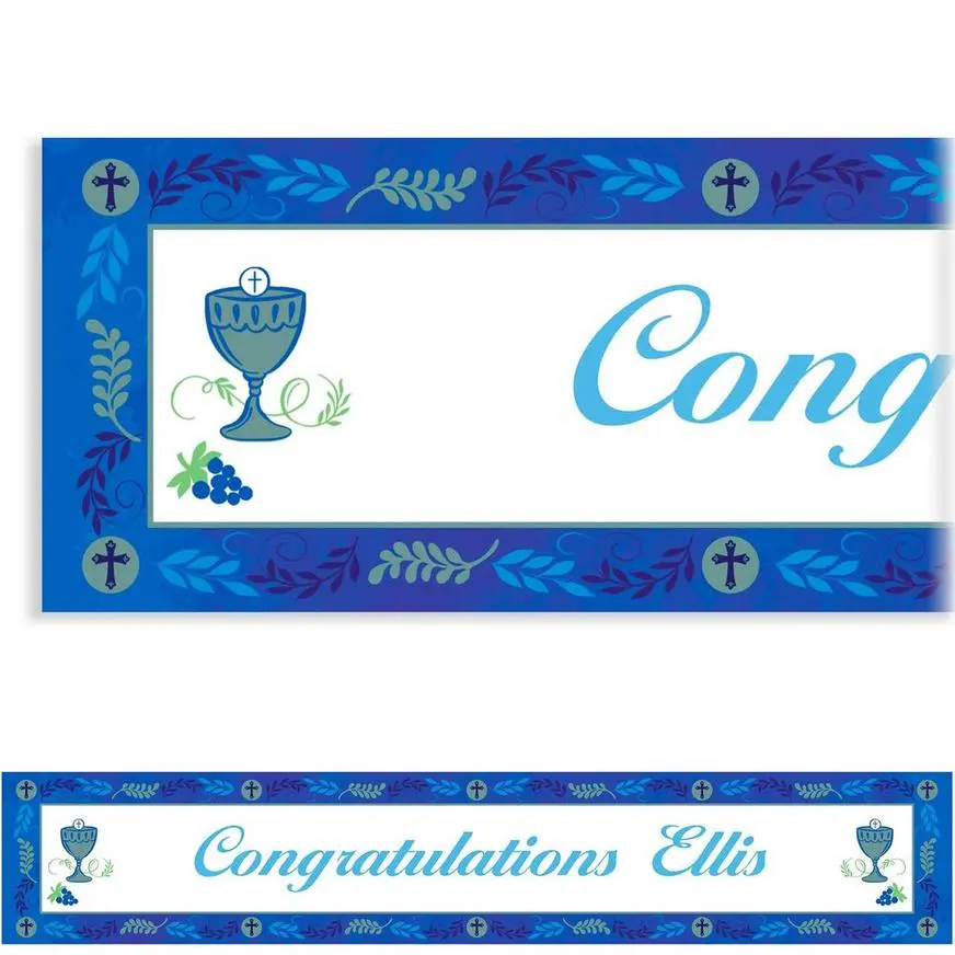 These custom Communion Day Boy Banners are sure to match your communion theme. At 6ft long, the banners make a big statement and complement your communion decorations. It’s easy to customize your message on party banners, and you can even change the font or text color! Customized banners can be printed on standard 98lb paper or on premium 11mm latex-saturated, nylon-reinforced material.