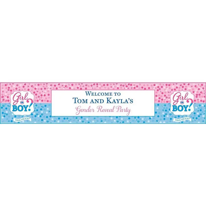 The custom Girl or Boy Gender Reveal Table Runner features a pink and blue polka dot background, question marks, and a “Girl or Boy?” headline. This large vinyl runner adds color and a personal message to your buffet table and is a great way to celebrate the guest of honor or recognize your special occasion! It’s easy to customize your table runner, and you can change the font and text color. This personalized table decoration is printed on indoor/outdoor 10oz vinyl and features latex ink that won’t fade.