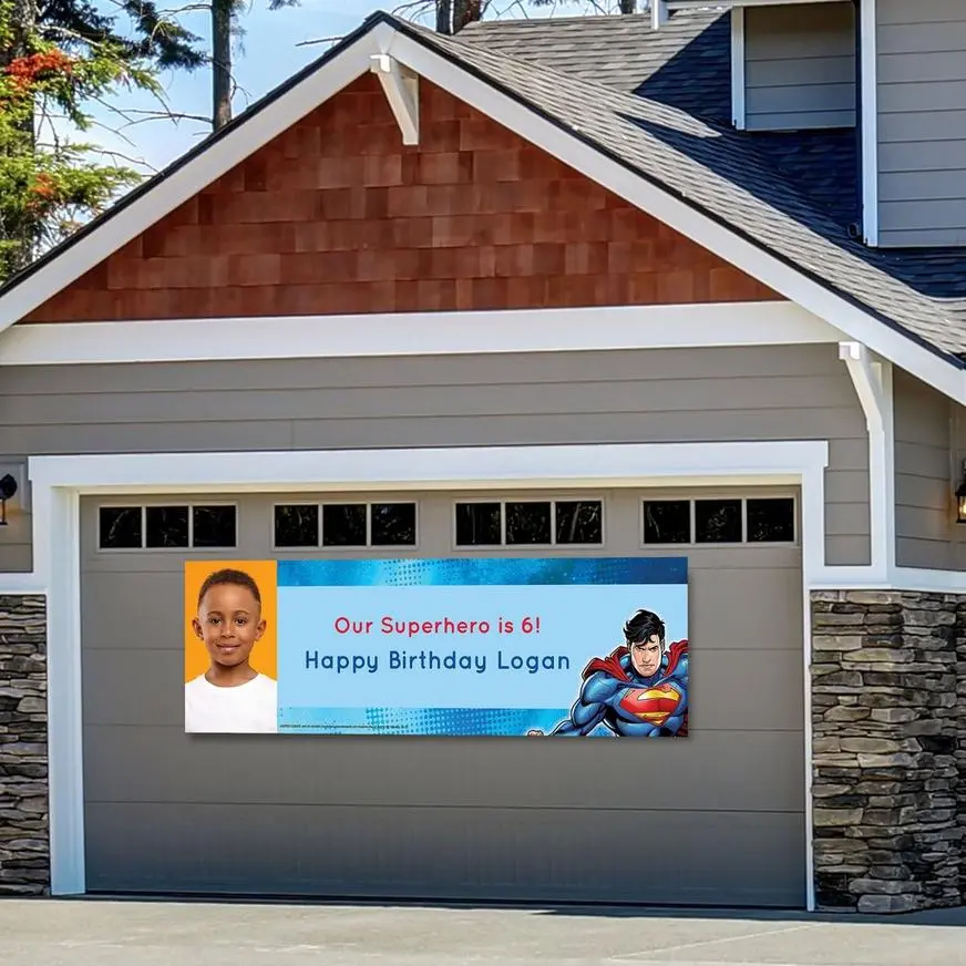 The custom Justice League Photo Horizontal Banner features Superman, a blue background, and space for a personalized message and photo. With three sizes to choose from, the banner makes a big statement and is a perfect way to celebrate the guest of honor or let guests know where the party is! It’s easy to customize your message on the party banner, and you can change the font and text color. This personalized banner can be printed on standard indoor/outdoor 10oz vinyl or heavy-duty 13oz vinyl, durable enough for outdoor use, and both weights feature latex ink that won’t fade.