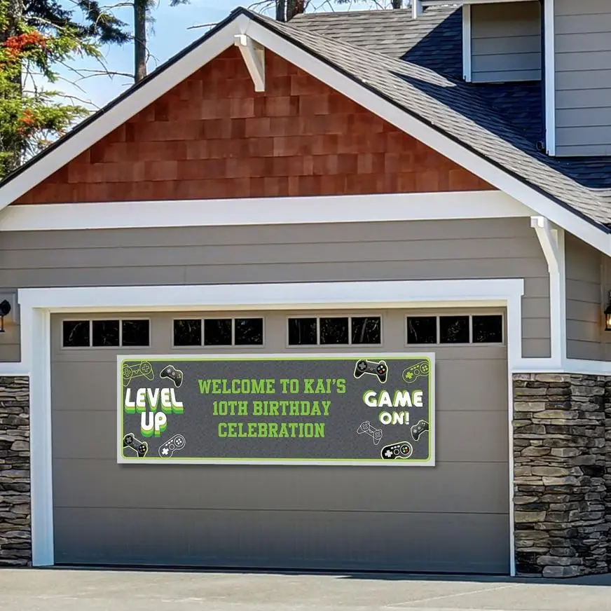 This custom Level Up banner features game controllers, a pixelated background, “Level Up” and “Game On” headlines, and space for your very own message. It’s easy to customize the message by choosing from the selection of font styles and text colors. A banner is the perfect way to celebrate the guest of honor and instantly lets guests know where the party is. This personalized banner is printed with fade-resistant latex ink on standard 10oz vinyl or heavy-duty 13oz vinyl that’s durable enough for outdoor events.