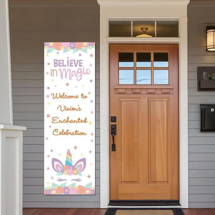 This custom Unicorn Lashes banner features a floral border, a star-filled background, a “Believe In Magic” headline, a pastel unicorn, and space for your very own message. It’s easy to customize the message by choosing from the selection of font styles and colors. A banner is the perfect way to celebrate the guest of honor and instantly lets guests know where the party is. This personalized banner is printed with fade-resistant latex ink on standard 10oz vinyl or heavy-duty 13oz vinyl that’s durable enough for outdoor events.