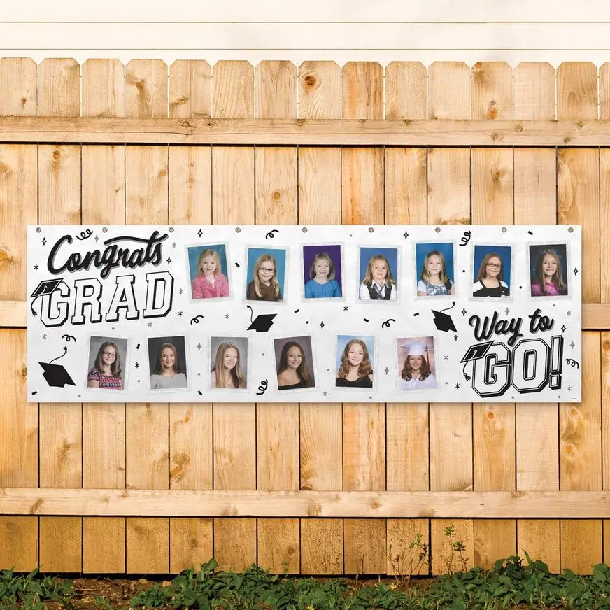 This custom graduation banner features “Congrats Grad!” and “Way To Go!” headlines on a black and white background. This large banner is the perfect size to display photos of an entire graduating class, or to show one grad throughout the years. Simply print out your photos and attach them to the banner for a personalized grad party display. Banners make a big statement and are the perfect way to celebrate this milestone achievement. This personalized banner is printed on durable plastic that’s reusable and holds up to outdoor use.