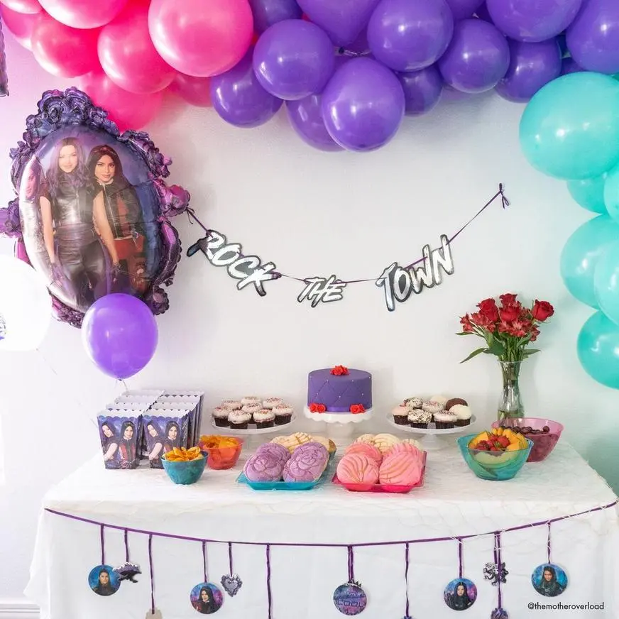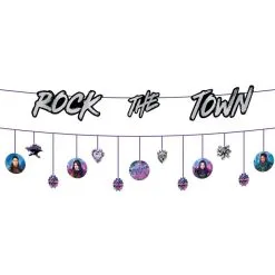 Decorate for your little villains birthday party with the Descendants 3 Banner with Mini Banner! This banner set feature a “Rock The Town” letter banner and a banner with circular cutout images of Evie, Jay, Mal, and Uma with other Descendants-themed image cutouts. Hang theses banners on a wall, table, or from the ceiling to add a villainous touch to the party decor.
