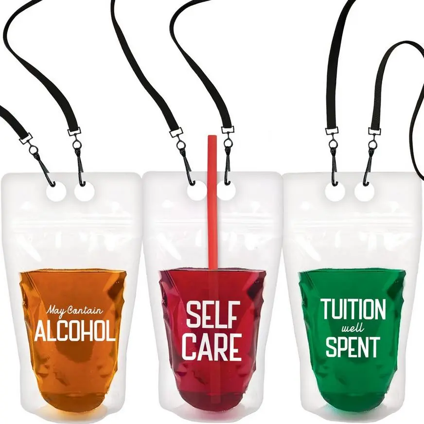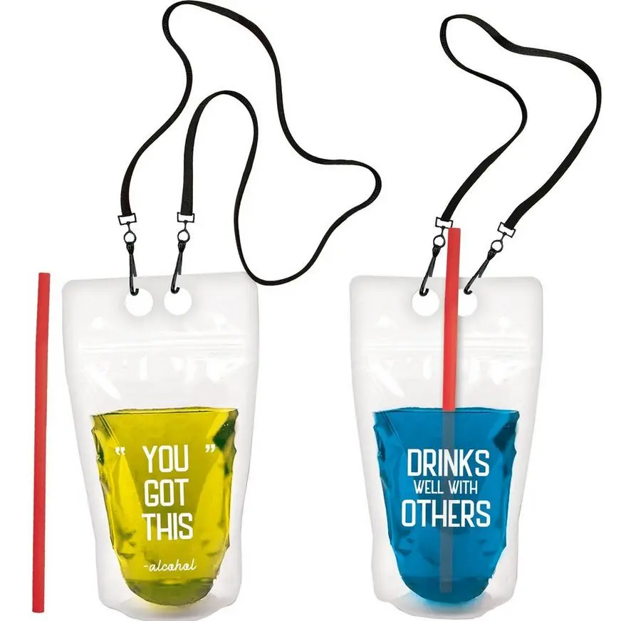Discover the next-level way to sip a cool beverage during a hot day! These drink pouch necklaces feature fun headlines, like “Self Care,” “May Contain Alcohol,” and “Drinks Well With Others.” Each pouch comes with a red straw and a black lanyard.