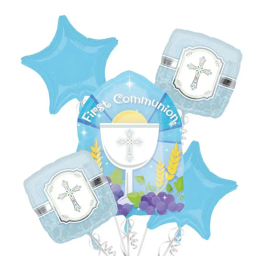 Celebrate his First Communion with a special balloon bouquet! This Blue Blessings First Communion Balloon Bouquet features elegant silver crosses with light blue accents. A blend of stripes floral scrollwork, these blue balloons are perfect for the stylish little boy!