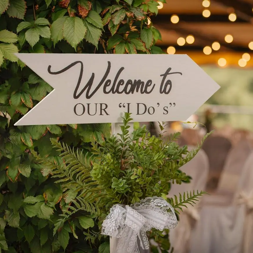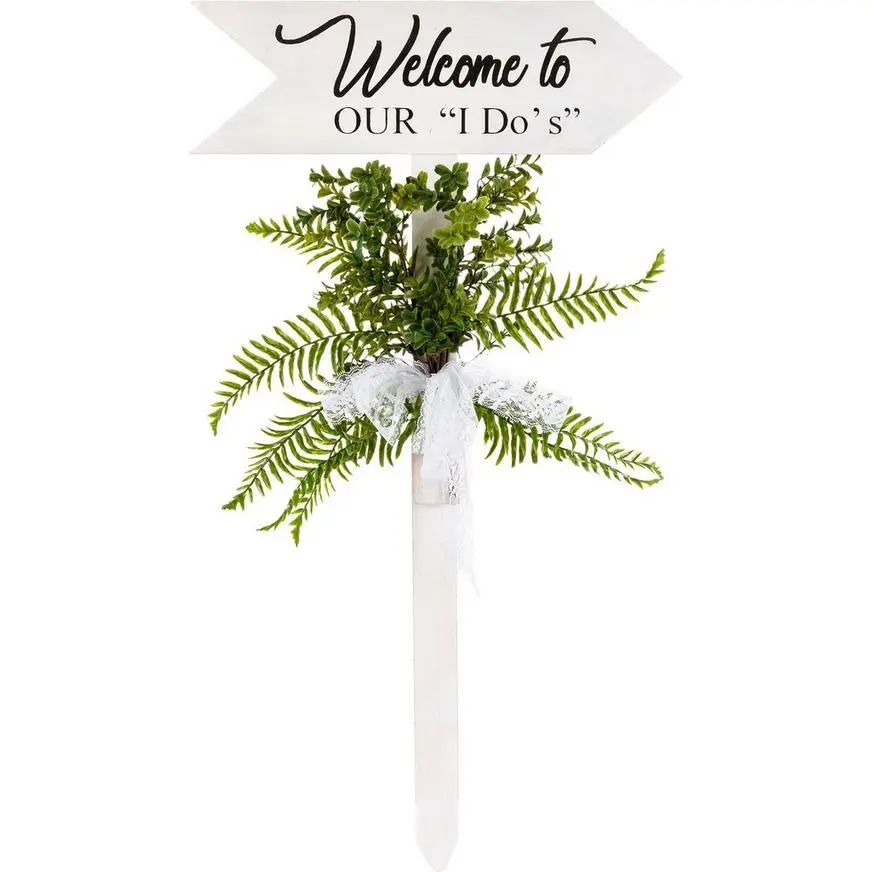 Give your wedding guests a lovely welcome with the Floral Greenery Stake Sign! This white wood staked sign points guests towards the ceremony with an arrow that reads “Welcome to Our ‘I Do’s.'” Below the arrow is artificial greenery tied with a white lace bow.