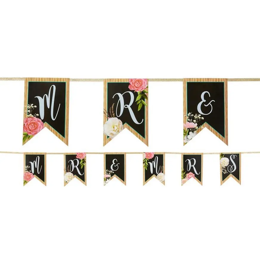 Add some shabby-chic charm to your wedding event with a Floral & Lace Rustic Wedding Pennant Banner! The swallow-tailed pennants are printed with a cursive letter to spell out “Mr. and Mrs.” Each pennant is printed with a black background with a wood border and pink and peach floral accents making this pennant banner perfect for a country wedding, rustic wedding, or even a tea party bridal shower. After assembly, hang this sweet rustic wedding decoration at your venue to create an instant dreamy, pastoral mood.