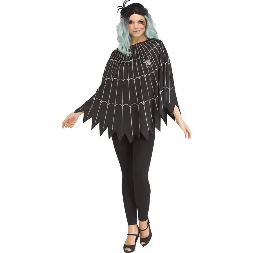 Be a glitter spider queen in the Spiderweb Poncho! This black polyester poncho features a spider in its web in rose gold glitter applique and a tattered fringe.