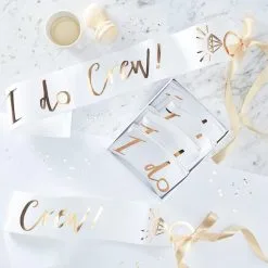 Let everyone know who’s part of the crew with these Ginger Ray Metallic Gold & White I Do Crew Sashes! They will add an extra touch of style to your bachelorette party, bridal, or wedding shower. The gorgeous gold script text says “I Do Crew!” on a white background so they will go with many themes. The wedding party can even take them home for a special keepsake.