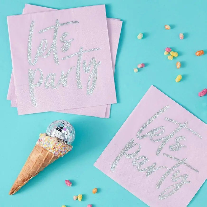 Ginger Ray Metallic Let’s Party Lunch Napkins are perfect for holding delicious snacks in style as you and your guests celebrate! The square pink paper napkins feature an iridescent silver “Let’s Party” message in script. Add shine to your table and liven up the party with these metallic napkins.