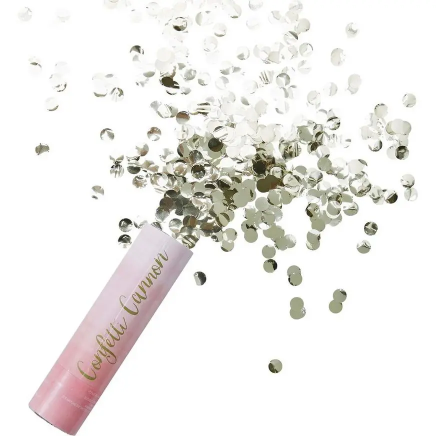 Celebrate any special occasion with a bang! This pink and white twist tube is spring-loaded and filled with metallic silver foil confetti. Simply twist the base and watch as pieces of shining confetti fill the air. Party poppers are a safe alternative to gunpowder confetti poppers, and make little noise so they won’t disturb the neighbors.
