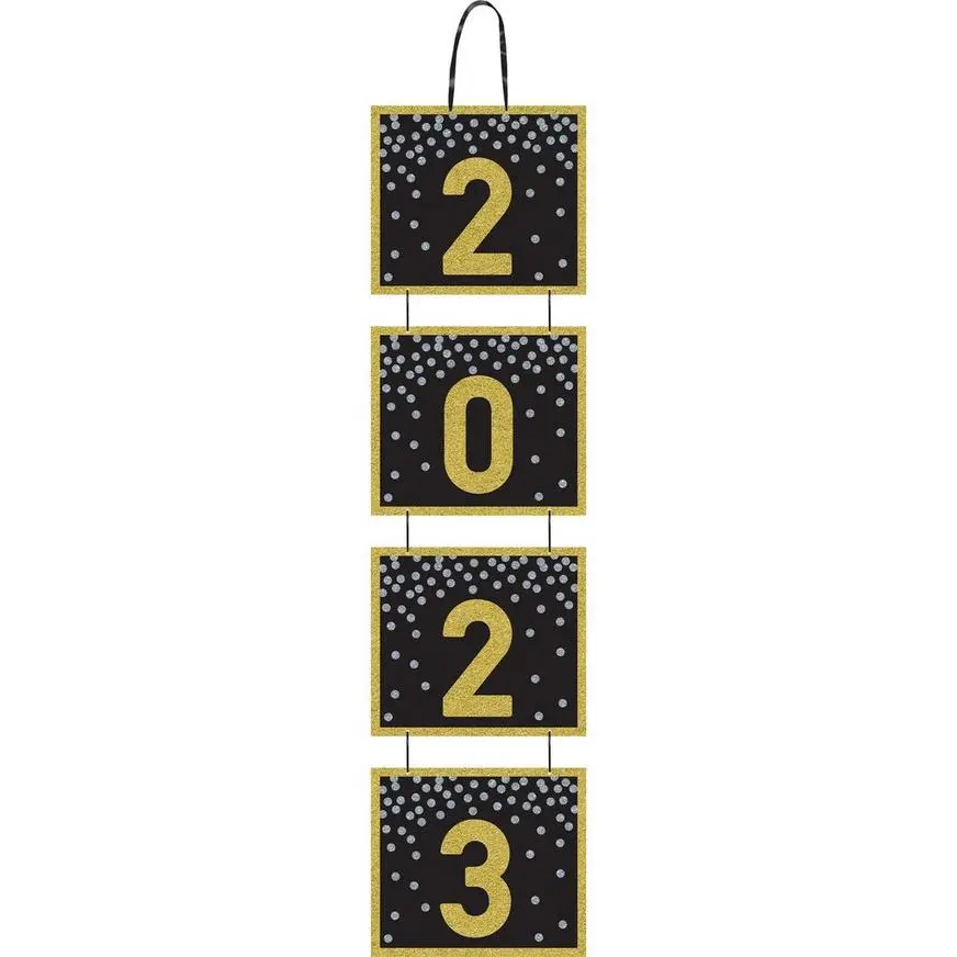 Add a classic touch to your New Year’s Eve party decorations with this hanging sign! Four large squares are strung together with ribbon. They’re black with gold and silver glitter and read “2023.” Use the attached ribbon to hang it indoors for your NYE celebration.