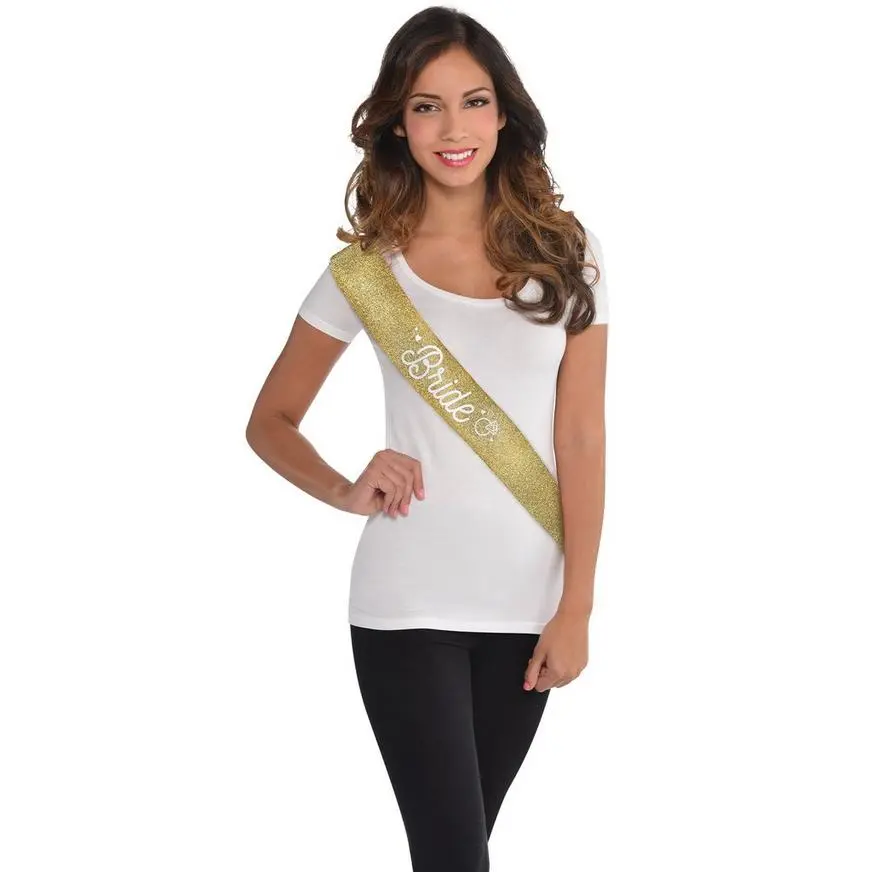 Here comes the bride! This glittery gold sash features the word Bride in white letters. Pick this up for yourself or your favorite bride to wear at her bridal shower or bachelorette party.