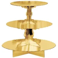 A Gold Cupcake Stand provides a lustrous touch to any party table! This gold, three-tiered cupcake stand comes with scalloped-edge borders for a stylish look. Durable and easy to assemble, this treat stand is perfect for cupcakes, candy, cookies, appetizers, or other delicious treats!