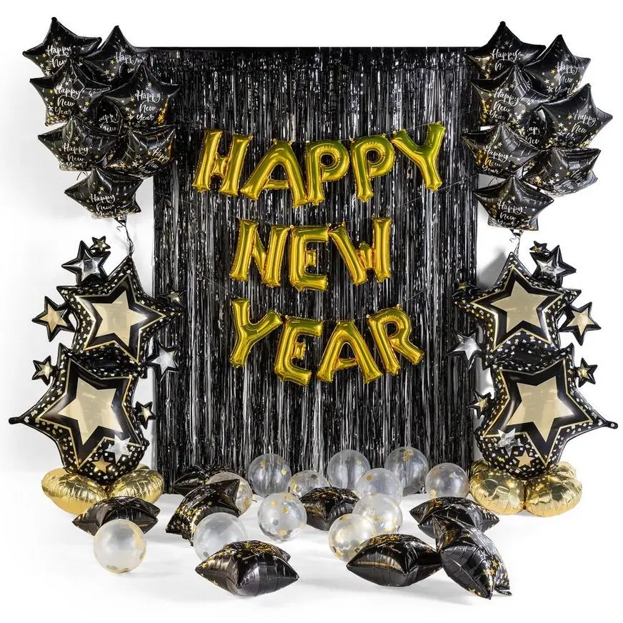 - Step 3: Create two 9-piece bouquets of Happy New Year Star Balloons and anchor them on either side of the curtains with balloon weights (sold separately).