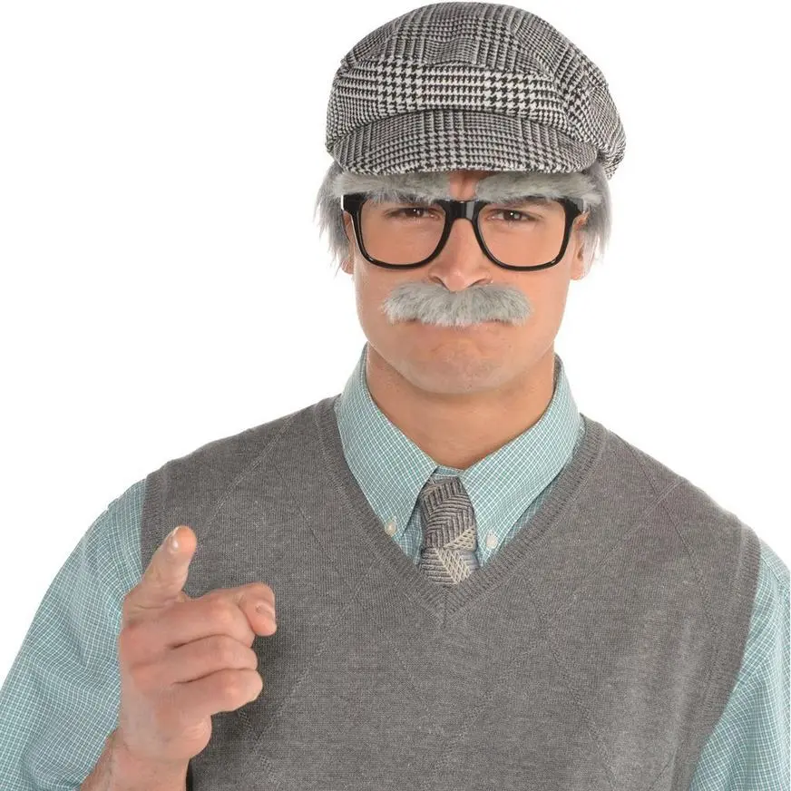 Turn into an old geezer this Halloween with a Grandpa Costume Accessory Kit! This accessory kit includes a white and black herringbone hat with attached gray hair, black glasses with attached gray eyebrows, and a gray moustache with adhesive backing. You will be putting in dentures to enjoy all the candy you receive in this grandpa costume! Shirt, vest, and tie not included.