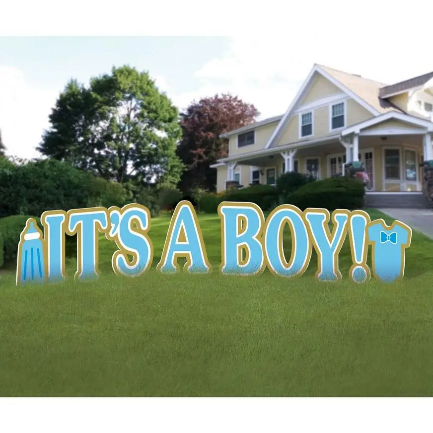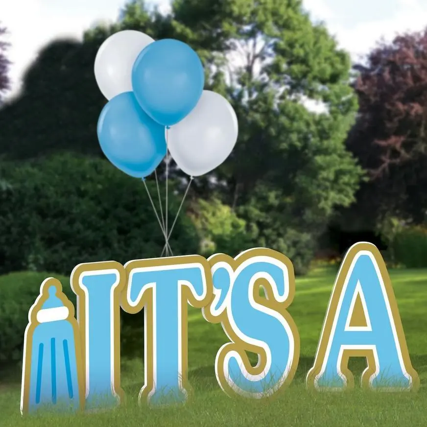 This “It’s A Boy!” yard sign set features a blue and gold design with a bottle on one end and a bodysuit on the other. Simply insert the metal stakes into the bottom of each sign about two inches apart, and they’re ready to secure into the ground. Add a balloon bouquet to the display to take it to the next level1