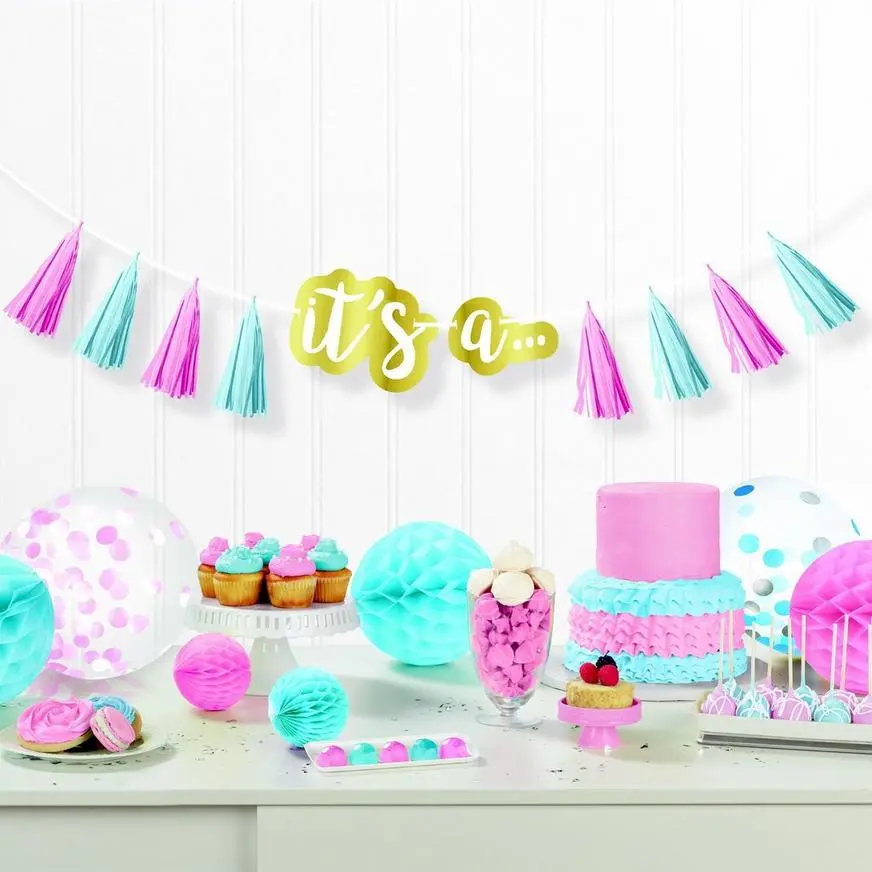 This garland features blue and pink tissue tassels and a metallic gold “It’s A…” headline in the center. Use it to decorate your event space or incorporate it into a photo booth background for a picture-worthy scene.