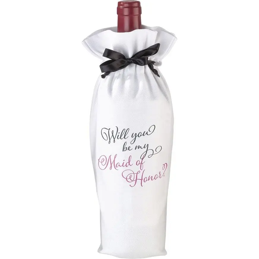 Ask a close friend or relative to be your maid of honor in a special way with this Maid of Honor Wine Bag! This fabric bag comes in white with a “Will You Be My Maid Of Honor?” headline in black and pink letters. The bag features black ribbon drawstrings on each side. Put a bottle of wine in this bag and give it to your desired maid of honor and she’ll have another reason to be excited for your wedding!