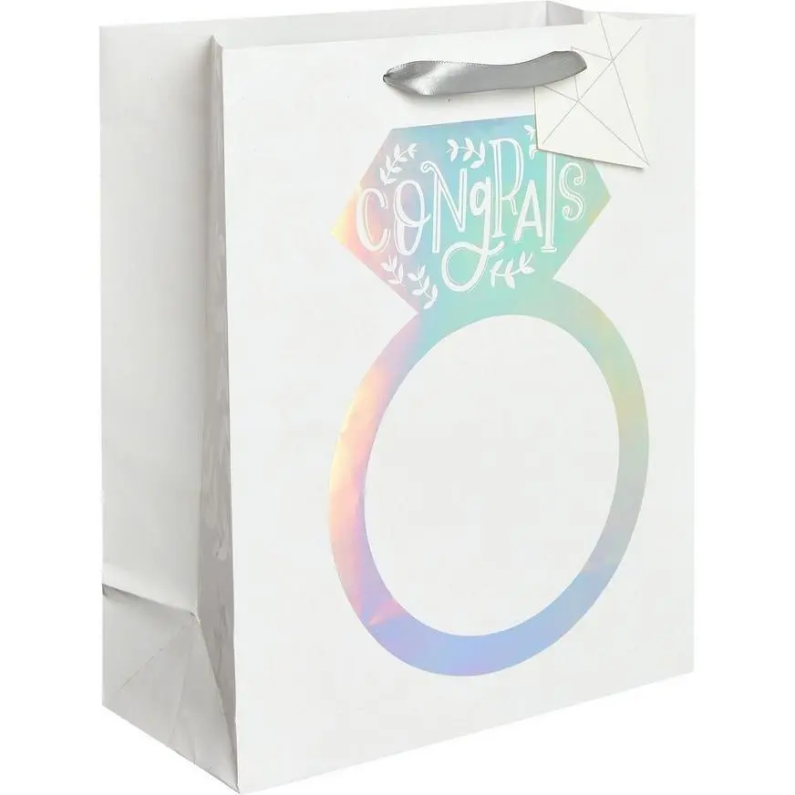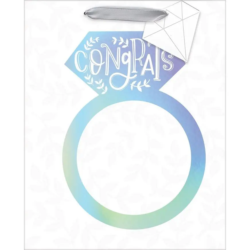 The perfect gift meets the perfect packaging with this Medium Paper Iridescent Engagement Ring Gift Bag! The large white paper gift bag features an iridescent diamond ring icon with the headline “Congrats” printed over top. Its silver ribbon handle has a diamond-shaped gift tag attached so you can write a message for the guest of honor. Put gadgets, homeware, and other engagement presents in this gift bag and it’s instantly ready for giving!