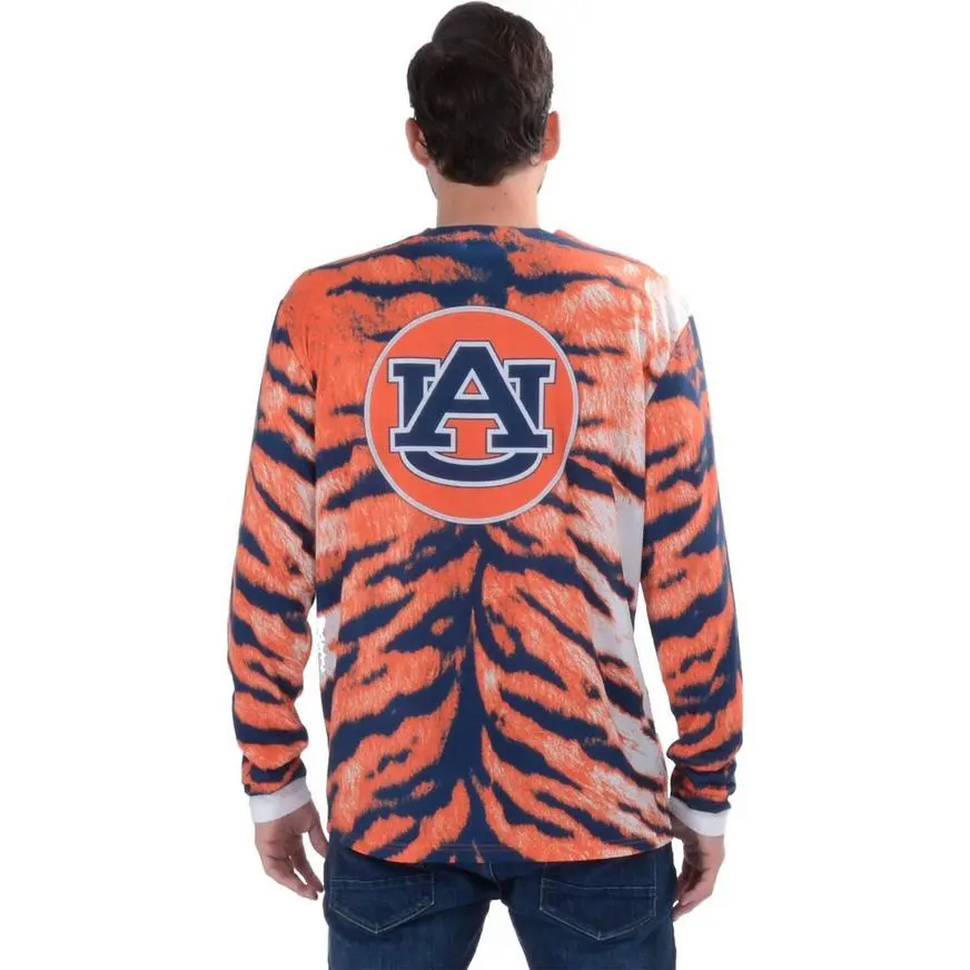 Show your school spirit in style with this Auburn Tigers Skin Suit Long-Sleeve Shirt. This soft and comfortable t-shirt has been photo-realistically printed with orange and navy tiger stripe suit and tie. GO TEAM! Review the size chart for additional sizing information.