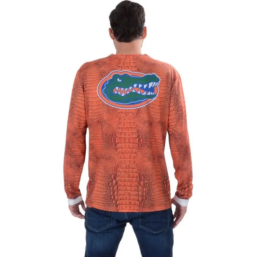 Show your school spirit in style with this Florida Gators Orange Skin Suit Long-Sleeve Shirt. This soft and comfortable shirt has been photo-realistically printed with an orange gator skin suit with blue accented lapel and tie. GO TEAM! Review the size chart for additional sizing information.
