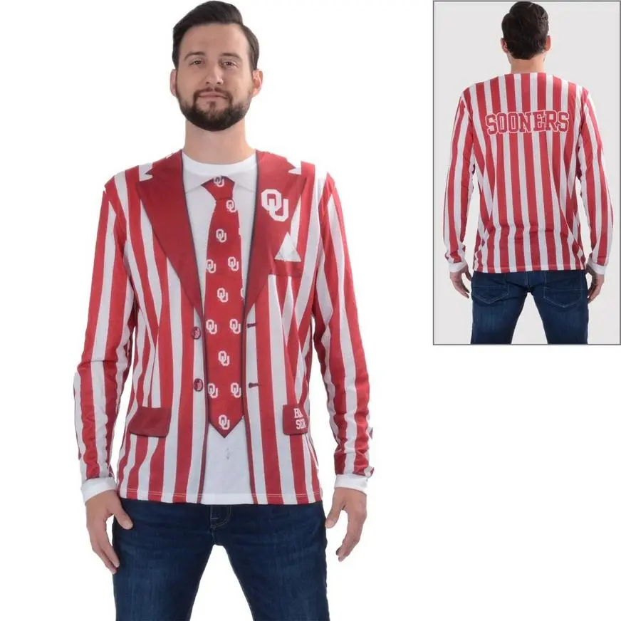 Show your school spirit in style with this Oklahoma Sooners Striped Suit Long-Sleeve Shirt. This soft and comfortable t-shirt has been photo-realistically printed with crimson and cream stripe suit with tie. GO TEAM! Review the size chart for additional sizing information.