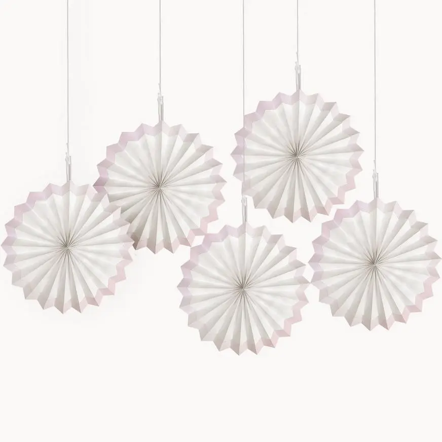 Brighten up your party décor in minutes with shimmering paper fans! These hanging fan decorations feature a white center and a light pink metallic border. Use the attached strings to hang them up wherever you need an eye-catching party decoration.