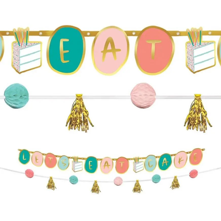 Create an eye-catching backdrop for their special day with two pastel banners! The large banner has circular cutouts that read “Let’s Eat Cake” with slices of birthday cake between the words. The small banner has alternating honeycomb balls and metallic gold tassels. Display them on a wall, buffet, or mantel to complete your decor.