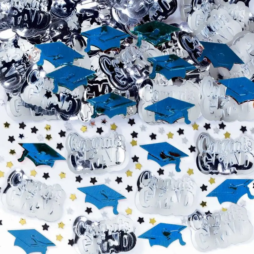 Add some school color sparkle to your graduation party! Metallic Royal Blue Graduation Confetti features blue foil graduation caps, die-cut silver “Congrats Grad” messages, and lots of small gold and silver stars. Perfect for decorating with your graduate’s favorite color, this shining confetti looks great sprinkled across a party table or included in graduation invitations and thank you notes to add an extra dash of fantastically fun color!