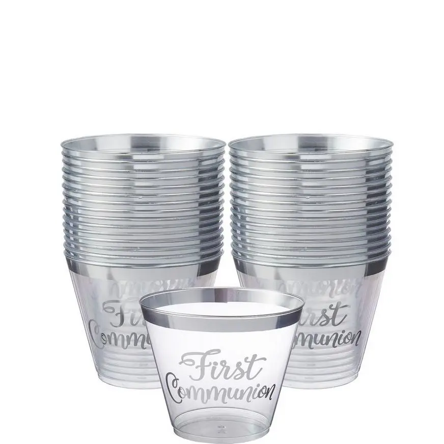 Cheers to the guest of honor after their communion ceremony with these Metallic Silver First Communion Plastic Cups! The transparent plastic cups feature a metallic silver border and a “First Communion” headline. Mix and match these small plastic cups with other religious tableware to set the table for a blessed party!